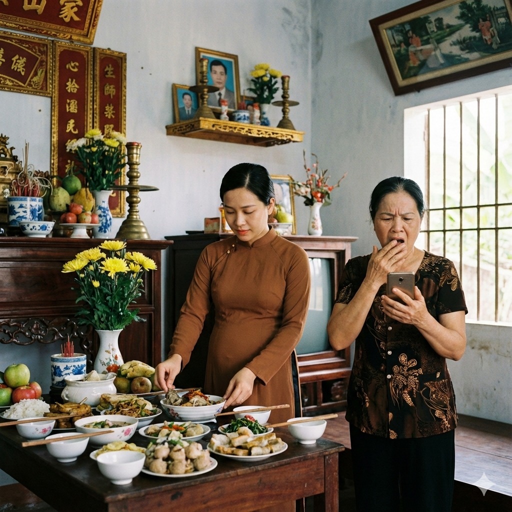 Hương chỉ lắc đầu. Sự im lặng làm sống mũi cô cay xè. Cô từng nghi ngờ Tuấn – chồng mình – đôi lần về muộn, nhưng không bao giờ ngờ mọi thứ lại phơi bày đúng lúc này, ngay trước bàn thờ bố chồng.